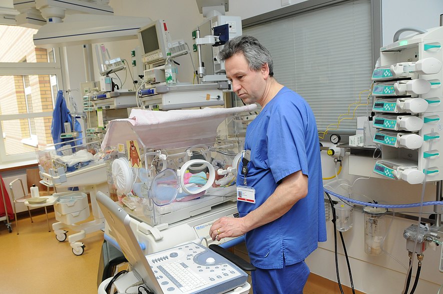 Im Intensivbereich liegen Kinder, die zu früh geboren sind, insbesondere wenn sie eine künstliche Atemhilfe benötigen. Wir führen alle Spezialbeatmungen durch. Ebenso behandeln wir Neugeborene mit schweren Anpassungsstörungen oder Infektionen, die besonders überwacht werden müssen.