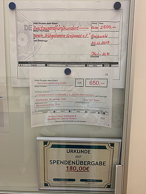 Am 20.12.2019 erhielten wir mehrere Spenden durch Kerstin Witte, eine Spende von einer Schulklasse aus Wolgast und Torgelow und einer KITA- Einrichtung, außerdem eine Geldspende entstanden durch die Silvestertombola im Mercure- Hotel Greifswald u. dem Steakhouse Wieck.