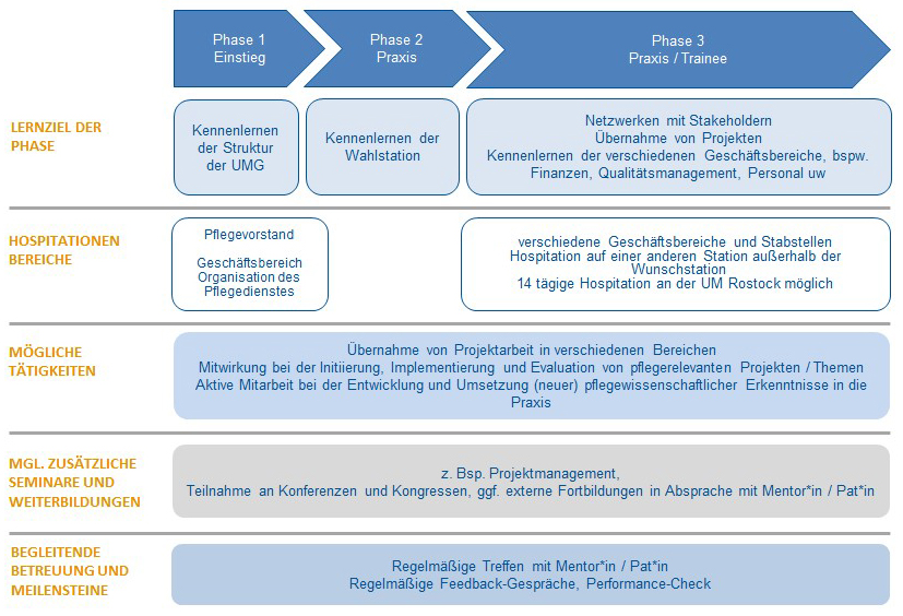 Das Traineeprogramm für Pflegemanagement (Dauer: 15 Monate, nach individueller Absprache bis max. 24 Monate möglich) der Universitätsmedizin Greifswald bietet Ihnen die Möglichkeit, Strukturen und Abläufe in einer Universitätsmedizin und im speziellen die Aufgaben von pflegerischen Leitungen, v.a. der Stations- bzw. Pflegedienstleitungen in ihrer Vielfalt kennenzulernen und Kompetenzen in diesem Bereich zu erwerben.