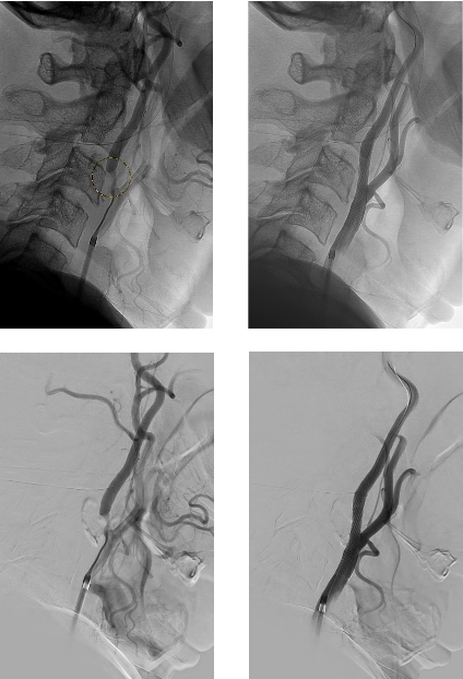 Die mit orangem Kreis markierte hochgradige Engstelle des Abganges der hirnversorgenden Halsarterie kann mittels Stent und Ballon-Aufdehnung (PTA) schonend beseitigt werden.