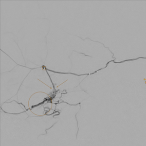 Ein sehr kleiner Katheter (Quadrat markierte Katheterspitze) wird über die Hirnhautarterie bis kurz vor den Fistelpunkt (Pfeile) gebracht. Es gilt nun mittels Klebe-Embolisat den Fistelpunkt zu verschließen und somit den hohen Druck von der Drainagevene (Kreis) zu nehmen.