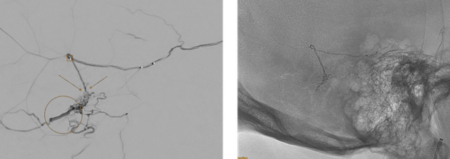 Vergleich Vorbefund (Bild links) mit Befund nach der Therapie (Bild rechts). Rechts zeigen sich die röntgendichten Embolisatanteile in der Fistel und der zuführenden Hirnhautarterie. Die Vene kontrastiert sich nicht mehr (nicht gezeigt). Die dAVF ist vollständig ausgeschaltet.