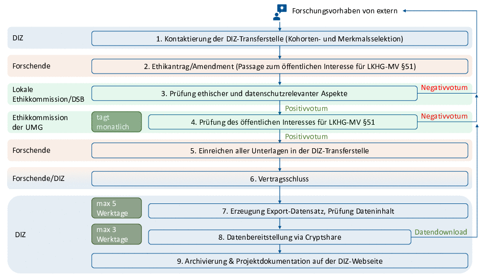 • bei Beantragung von Forschungsdaten entspr. Landeskrankenhausgesetz Mecklenburg-Vorpommern (LKHG-MV) § 51 zwingend Passage zum "öffentlichen Interesse" im Ethikantrag notwendig