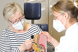 Foto: UMG/Markus Blaurock Oberärztin Tina Brzoska (re.) demonstriert in der Ohrsprechstunde an der Unimedizin Greifswald die Funktionsweise eines Cochlea-Implantats.