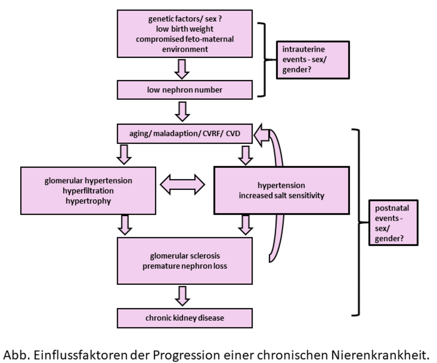 Die chronische Nierenkrankheit (CKD) betrifft 10-15% der Bevölkerung – die Prävalenz ist bei Frauen höher, aber die Progression ist bei Männern schneller. Einflussfaktoren für das Fortschreiten einer CKD, sowie Diagnostik, Therapie und Management der CKD sind geschlechtsspezifisch verschieden, werden in Leitlinien aber nicht berücksichtigt. Ziele sind daher eine geschlechtssensible Identifizierung von beeinflussbaren Risikofaktoren der CKD, die Entwicklung und Anwendung von Gender Scores sowie die Überprüfung von klinischen Leitlinien und Unterstützung bei der Erstellung eines systematischen Leitlinienreviews (aktuelles BMFTR-Projekt).