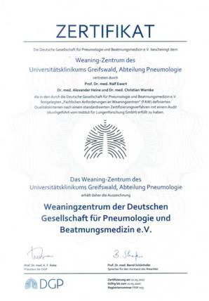 Unter Weaning versteht man die Entwöhnung von der künstlichen Beatmung. Seit November 2005 besteht an der Universitätsmedizin eine Weaningeinheit, welche seit 2010 durch die Gesellschaft für Pneumologie und Beatmungsmedizin (DGP) zertifiziert ist. Betroffen sind Personen, die aufgrund einer Erkrankung bzw. eines komplizierten Krankheitsverlaufes eine Beatmung benötigen und die Entwöhnung in ersten Versuchen scheiterte. Um diesen Menschen die Perspektive einer möglichen Beatmungsentwöhnung zu geben, bedarf es der Etablierung eines modernen spezialisierten Weaningzentrums. Unter diesen Vorgaben wurde das Weaningzentrum Greifswald gegründet und entwickelt. Meist werden die Patienten von anderen Intensivstationen übernommen, nachdem dort mehrere Entwöhnungsversuche fehlgeschlagen sind oder gar nicht erst unternommen werden konnten. Die Entwöhnung gelingt nicht immer, aber doch häufig. Auch in Fällen, in denen eine Entwöhnung nicht möglich ist, organisieren wir in Absprache und entsprechend der Wünsche unserer Patienten eine außerklinische Beatmungsversorgung.
