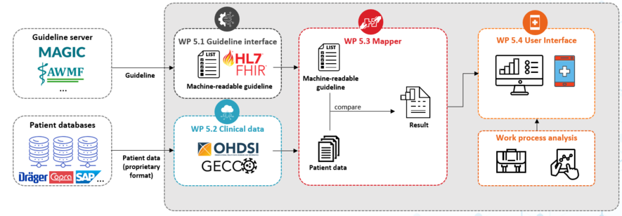 Eine lückenlose Umsetzung von klinischen Leitlinienempfehlungen setzt voraus, dass das ärztliche und pflegerische Personal nicht nur die Empfehlungen kennt, sondern auch jede Situation erkennt, in der sie anwendbar sind. Daher entwickeln wir ein Entscheidungsunterstützungssystem, das eine automatisierte Überwachung der Einhaltung von Leitlinienempfehlungen bei einzelnen Patienten ermöglicht.