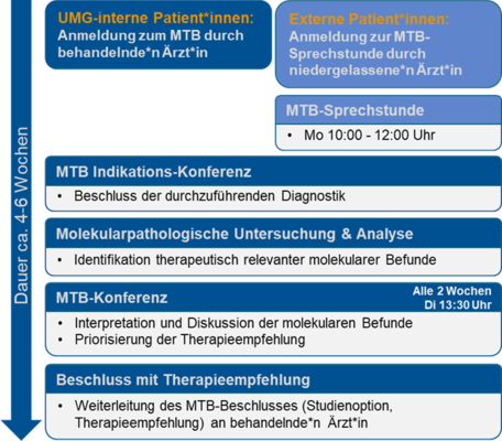 Die Ergebnisse der molekularpathologischen Diagnostik werden im MTB vorgestellt und gemeinsam diskutiert. Auf dieser Grundlage wird ein Tumorboardbeschluss gefasst, aus dem sich eine individuelle Therapieempfehlung oder die Empfehlung zur Teilnahme an einer klinischen Studie im Rahmen eines personalisierten Therapiekonzepts ergeben kann.