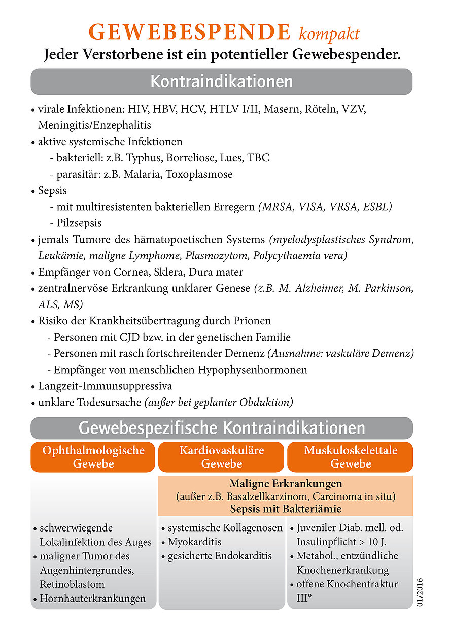 Jeder Mensch kann nach seinem Tod Gewebe spenden. Es gibt keine Altersgrenzen. Gewebespenden sind auch noch mehrere Tage nach einem Herzstillstand und in jedem Krankenhaus möglich.