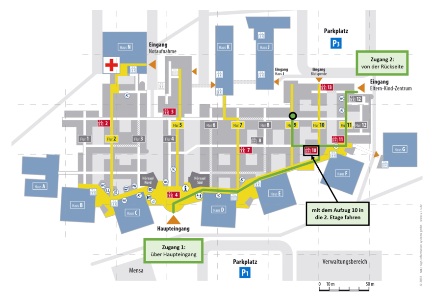 Für den Fall, dass der Parkplatz P1 bereits besetzt ist, können Sie auch den Parkplatz P3 nutzen. Dieser ist über die Ferdinand-Sauerbruch-Straße erreichbar. Von dort gelangen Sie über den Eingang "Eltern-Kind-Zentrum" auf Flur 11 in das Klinikum. Begeben Sie sich anschließend in den Flur 10 zu Aufzug 10 und fahren mit diesem in der 2. Obergeschoss. Von dort gehen Sie nach links bis zum Flur 9. Dort biegen Sie rechts ab und sie haben die Prä-OP-Station erreicht.