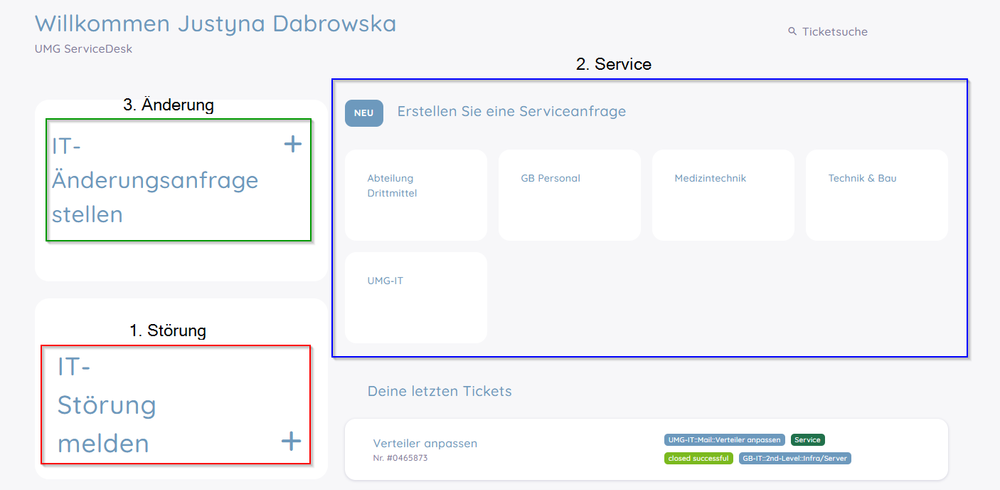 - Falls ein Ticket von Ihnen erstellt wurde oder für Sie zur Bearbeitung (z.B. Freigabe) vorliegt, finden Sie dieses unter der Auflistung „Deine letzten Tickets“.