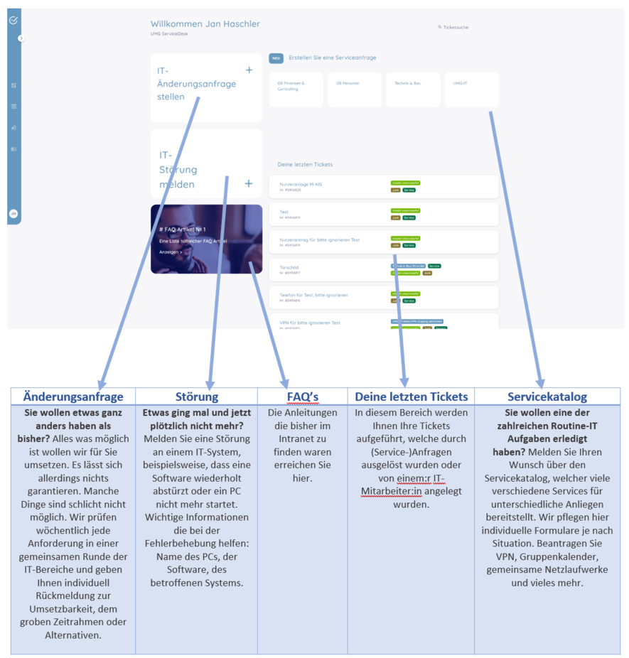 Wie bereits erwähnt, ist das Kundenportal die ideale Möglichkeit, Ihre Anliegen an uns zu übermitteln und eine schnelle Bearbeitung sicherzustellen. Der folgende Screenshot gibt Ihnen einen kurzen Überblick über das Portal und erklärt übersichtlich, welche Funktionen Sie an welcher Stelle finden.