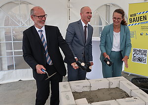 Am 21. Juni fand die feierliche Grundsteinlegung des Gesundheitsforschungsneubaus "William B. Kannel Center for Community Medicine" der Universitätsmedizin Greifswald statt. Wissenschaftsministerin Bettina Martin, Prof. Dr. Uwe Reuter, Vorsitzender des Ärztlichen Vorstandes der Universitätsmedizin Greifswald, Prof. Dr. Wolfgang Hoffmann, Direktor des Instituts für Community Medicine (ICM), Heiko Miraß, Parlamentarischer Staatssekretär für Vorpommern und das östliche Mecklenburg sowie Stefan Wenzl, Abteilungsleiter des Finanzministeriums Mecklenburg-Vorpommern, legten den Grundstein für den ca. 64,2 Mio. Euro teuren Neubau. In den Grundstein wurde eine Zeitkapsel mit Hammerschlägen eingebracht und anschließend vermörtelt. Die Zeitkapsel enthält eine Urkunde zur Grundsteinlegung, eine Tageszeitung, Baupläne, Geld-Münzen sowie die Jubiläumsbroschüre des ICM. An der Grundsteinlegung nahmen außerdem der Landrat Vorpommern-Greifswald, Michael Sack, der Oberbürgermeister der Universitäts- und Hansestadt Greifswald, Dr. Stefan Fassbinder, und der Prorektor für Forschung, Digitalisierung und Transfer der Universität Greifswald, Prof. Dr. Ralf Schneider, teil. Das "William B. Kannel Center for Community Medicine" wird als interdisziplinäres Zentrum für Gesundheitsforschung alle sechs Abteilungen des ICM unter einem Dach vereinen. Die Bauarbeiten der von Bund und Land finanzierten Baumaßnahme haben im Oktober 2022 begonnen. Die Fertigstellung ist für das Jahresende 2026 geplant. Das Forschungsgebäude wird dann auf einer Nutzungsfläche von 7.488 m2 Platz für rund 380 Mitarbeiterinnen und Mitarbeiter bieten und die tägliche Untersuchung von über 170 Personen ermöglichen. "Ich freue mich sehr, dass das neue Aushängeschild der Universitätsmedizin Greifswald nun Stück für Stück Realität wird. Die Gesundheitsspitzenforschung findet hier ihr neues Zuhause. Ein energetisch nachhaltiges Zuhause. Hier werden hocheffiziente Haustechnik, spezielle Dämmstoffe und Wärmerückgewinnungsanlagen verbaut. Und wir errichten eine Photovoltaikanlage mit 88 Modulen, die eine jährliche CO2-Einsparung in Höhe von ca. 23 Tonnen ermöglichen wird", sagte der für den Landesbau zuständige Finanzminister Dr. Heiko Geue. Wissenschaftsministerin Bettina Martin stellte fest: "Das Institut für Community Medicine hat mit seiner exzellenten Arbeit in den vergangenen 20 Jahren national und international ein Alleinstellungsmerkmal und ein hohes Renommé erlangt. Mit dem neuen "William B. Kannal Center" wird diese wichtige Forschungsarbeit nun auf ein noch höheres Level geführt und stark für die Zukunft aufgestellt. Der Bau am zentralen Campus der Universitätsmedizin, in unmittelbarer Nähe zu den Instituten und Kliniken, führt die verschiedenen Disziplinen an einem Standort zusammen. Das verbessert sowohl die Forschungsbedingungen als auch die Übertragung in die klinische und therapeutische Praxis enorm." "Vor 20 Jahren begannen Wissenschaftlerinnen und Wissenschaftler der Community Medicine Daten zum Gesundheitszustand, zur Gesundheitsvor- und -fürsorge der Bevölkerung zu sammeln. Sie nahmen schon damals ein Thema in den Fokus, dessen Bedeutung uns mit der Coronapandemie erneut eindrücklich vor Augen geführt wurde. Auch bei der Sammlung und Verarbeitung von Gesundheitsdaten wurde und wird hier Pionierarbeit geleistet. Das neue "William B. Kannel Center for Community Medicine" wird hervorragende Bedingungen bieten, diese Greifswalder Erfolgsgeschichte fortzuschreiben", so Prof. Dr. Katharina Riedel, Rektorin der Universität Greifswald. Prof. Dr. Uwe Reuter, Vorstandsvorsitzender und Ärztlicher Vorstand der Universitätsmedizin Greifswald erläutert: "Der Forschungsschwerpunkt Community Medicine der Universitätsmedizin Greifswald ist seit vielen Jahren bundesweit und international anerkannt. Wir sind dem Land Mecklenburg-Vorpommern und dem Bund sehr dankbar, dass sie unsere erfolgreiche Arbeit mit dem Neubau unterstützen, der hier entsteht. So können wir die Bevölkerungsgesundheit weiter stärken. Wir werden unserem Unternehmensmotto gerecht und gehen gemeinsam mit den Menschen nachhaltig in eine gesunde Zukunft." Verantwortlich für die Baumaßnahme ist das Staatliche Bau- und Liegenschaftsamt (SBL) Greifswald aus dem Geschäftsbereich des Finanzministeriums. Weitere Informationen finden Sie auf den Internetseiten des SBL Greifswald.